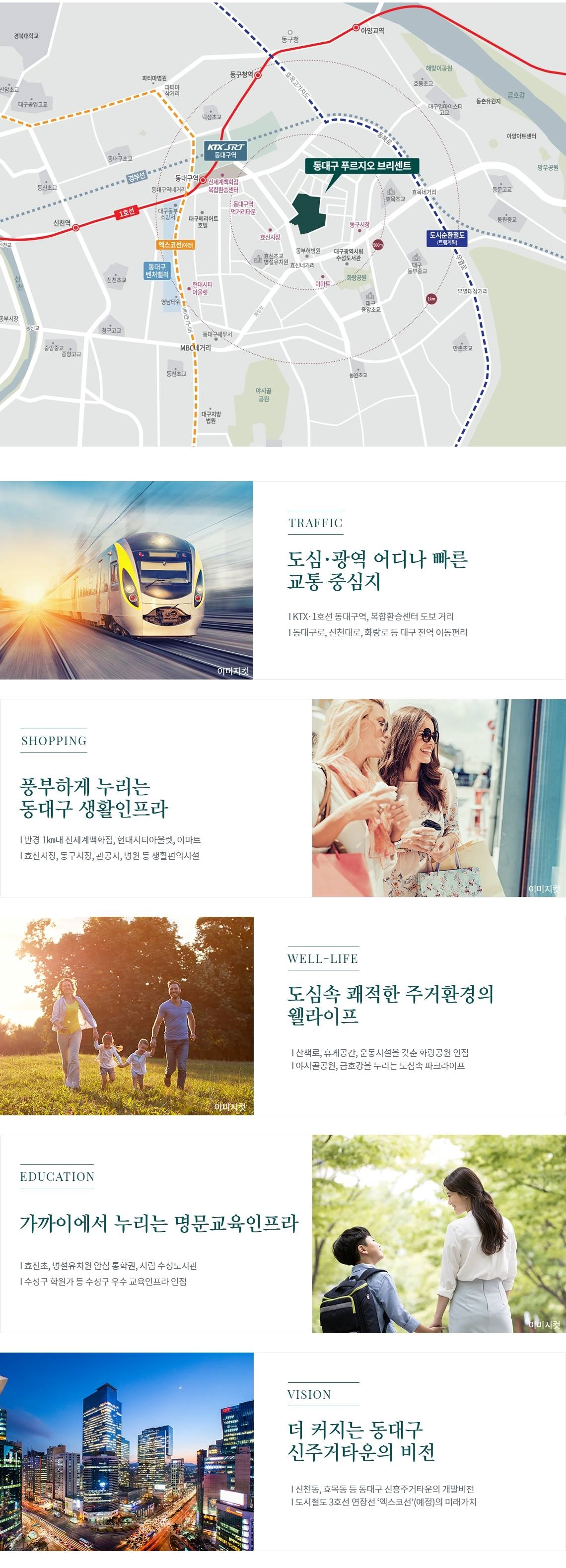 동대구 역세권의 압도적 비전 신주거 타운으로 변모하는 동대구의 새로운 랜드마크 동대구역 일대 대규모 주거 개발의 중심에서 미래 가치가 더욱 기대되는 프리미엄 주거 단지로 자리매김합니다. 사통팔달 쾌속 교통의 허브 KTX, SRT, 지하철 1호선과 복합환승센터를 곁에 둔 생활 대구 전역과 전국을 빠르게 잇는 최상의 교통 네트워크를 통해 더 넓은 생활권과 편리함을 동시에 누릴 수 있습니다. 수성구와 맞닿은 더블 생활권 동대구의 편리함과 수성구의 인프라를 동시에 누리는 입지 행정구역상 동구에 위치하면서도 수성구의 우수한 학군과 생활 인프라를 가깝게 공유하는 독보적인 입지 강점을 지닙니다. 푸르지오가 제안하는 명품 주거 설계 채광과 통풍을 극대화한 남향 위주 배치와 차별화된 조경 브랜드만의 고품격 특화 설계를 적용하여 일상의 자부심을 높여주는 쾌적하고 세련된 공간을 완성했습니다. 완성된 원스톱 에듀 및 문화 환경 초등학교를 품은 학세권과 대형 쇼핑몰이 인접한 중심지 도보 통학이 가능한 교육 환경과 신세계백화점, 파티마병원 등 다양한 생활 편의시설이 밀집한 완벽한 주거 인프라를 갖추었습니다. 여유를 채우는 다채로운 커뮤니티 그리너리 라운지에서 즐기는 입주민만의 고품격 여가 피트니스 클럽, 골프클럽, 도서관 등 삶의 활력을 더해주는 품격 높은 커뮤니티 시설이 단지 내에 조성됩니다.